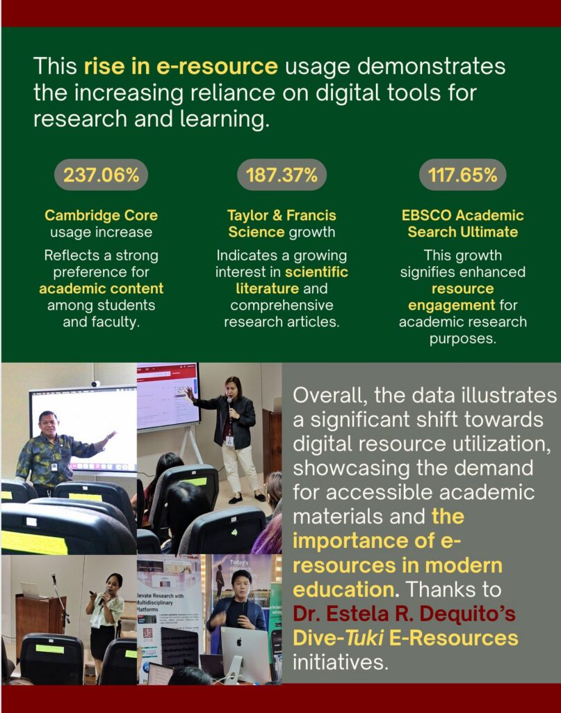 “The University Library is delighted to inform everyone of this great news received recently from the UP System,” she stated. “The report notably observed a significant rise in access to and use of almost all UP Mindanao e-resources. This shows how helpful our Library Literacy program, the Database Instruction, and Value Exploration-Tuki, which was launched early in November 2025 and implemented in the same month.